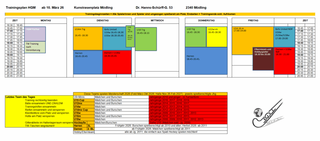 Wir freuen uns sehr auf das Feldhockeyjahr 2026. Für einen guten Start, hier die aktuellen Trainingstermine bis Sommer:
