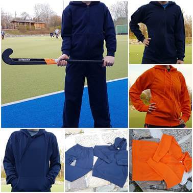 T-Shirts, Sweater, Jackets und Pants liegen in verschiedenen Größen beim Hockeyplatz zum Probieren auf.